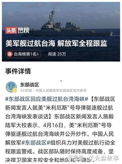 与此同时,美军航母的动向也引起了广泛关注。据媒体报道,美国海军“尼米兹”号航母编队近日穿越台湾海峡,进行所谓的“自由航行”行动。此举无疑是对我国领土主权的严重挑衅。我国国防部发言人表示,美军航母编队穿越台湾海峡,是美台勾连的又一表现,严重破坏台海和平稳定。